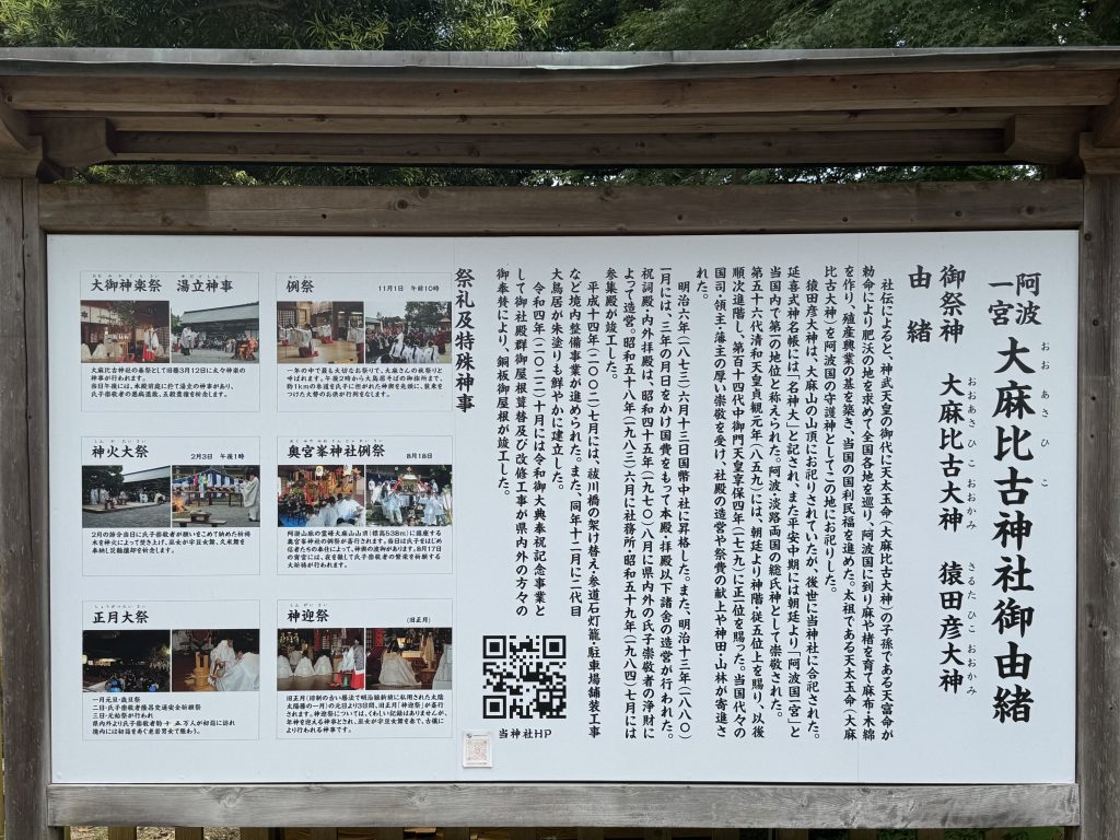 大麻比古神社の拝殿前の鳥居の、手前右側にある「由緒書」です。