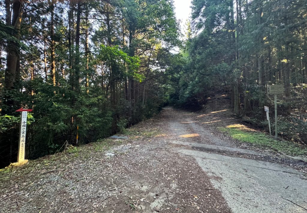 左の道が「小國一宮三ツ石」方面、正面の道が「本宮山登山口」方面です。